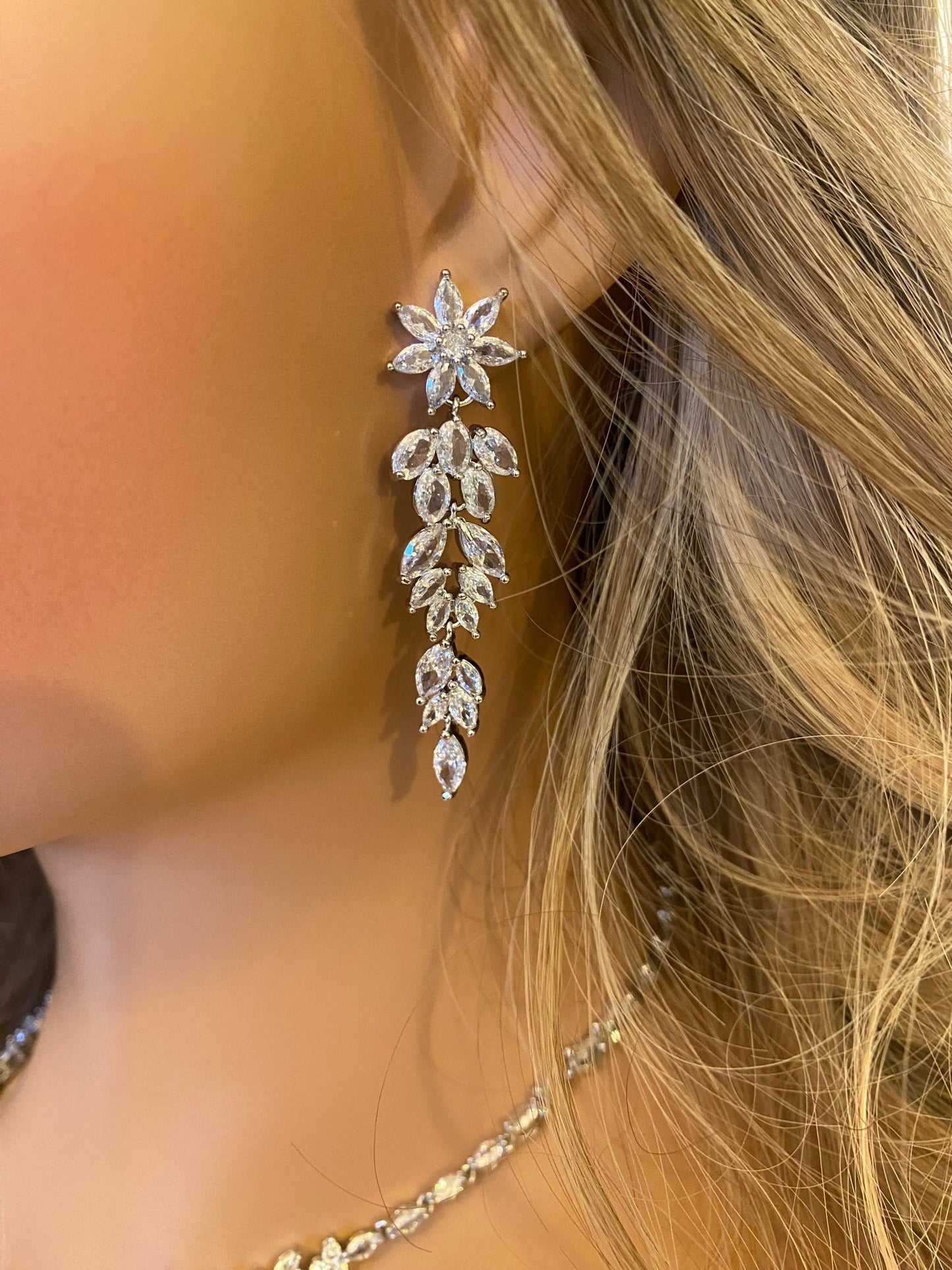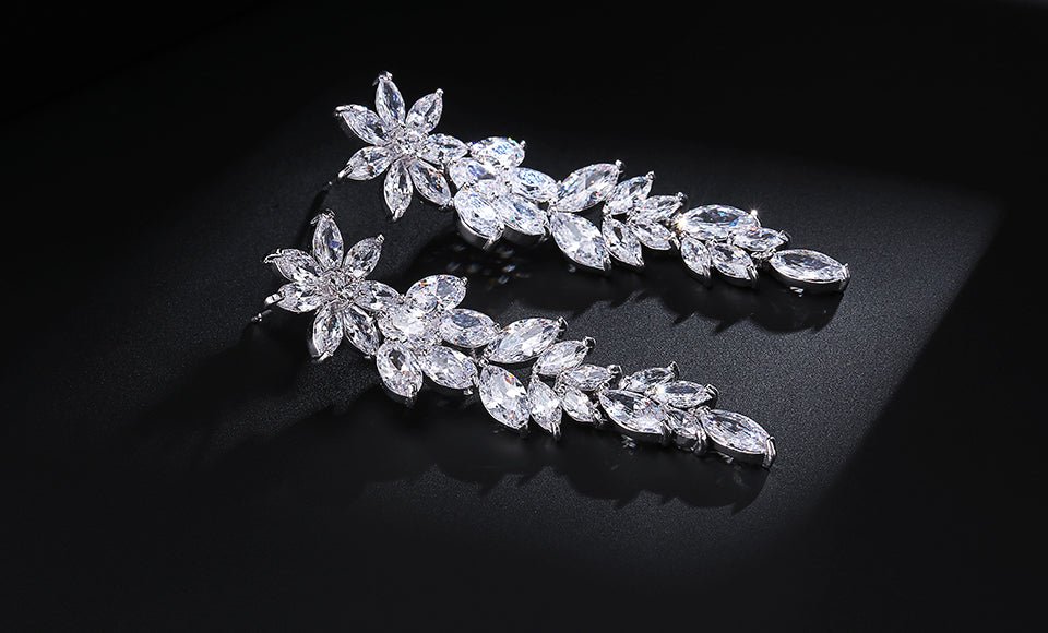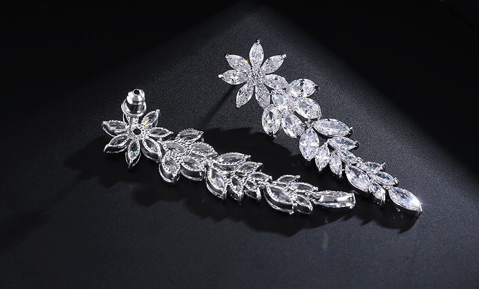 Diese atemberaubenden baumelnden Tropfenohrringe mit Zirkonia im Blumendesign sind das Highlight jedes Brautkleids.