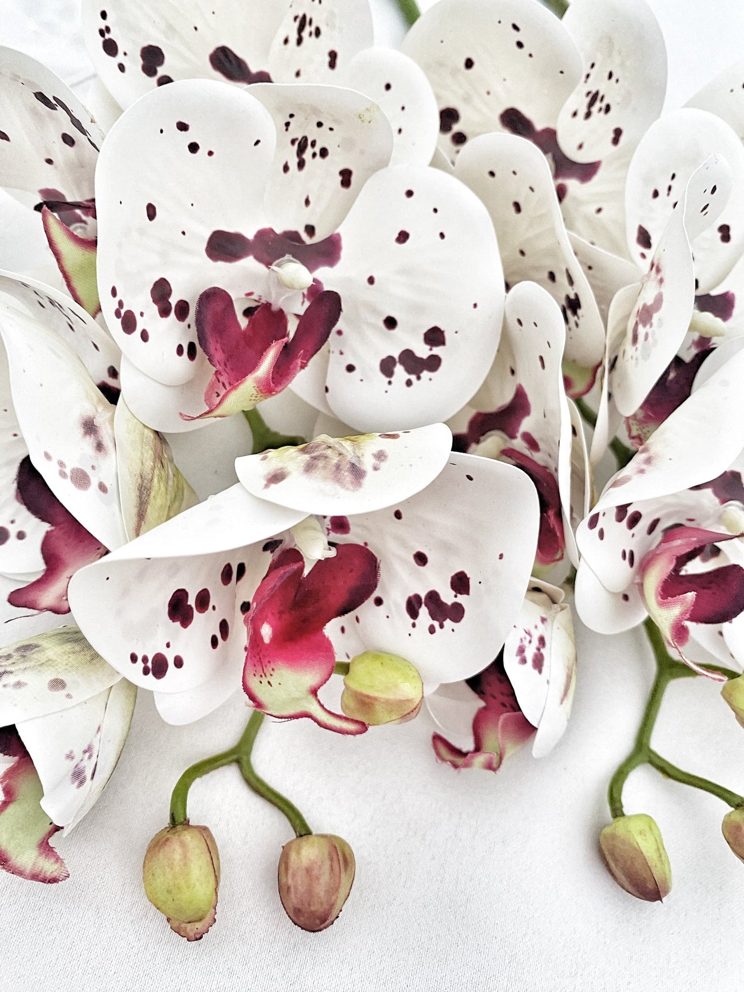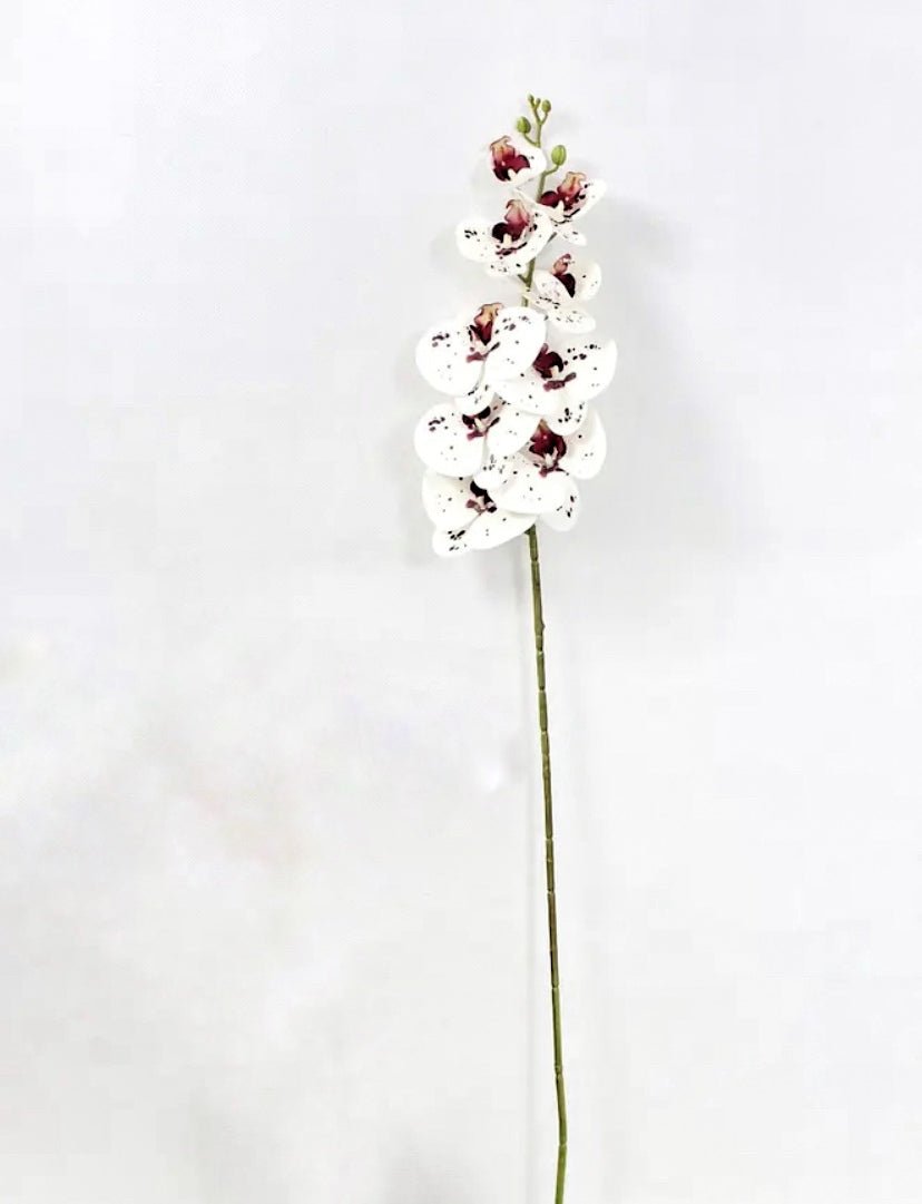 Orchidée artificielle mouchetée blanche avec des taches rouge foncé. Fleur d'orchidée Phalaenopsis.